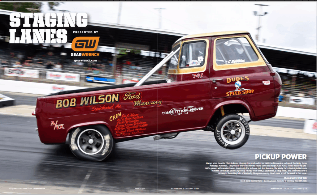 The latest chapter in Bain’s storied career unfolds in Drag Illustrated‘s Issue 196 (September/October 2025), where he delivers a masterclass in immersive storytelling. Turning his focus to the Wally Parks Nostalgia Nationals at Beech Bend Raceway Park in Bowling Green, Kentucky, Bain pens “Kentucky Fried Pistons,” a feature celebrating Tyler Hilton’s fourth straight Top Fuel title. Bourbon-soaked nights and bluegrass vibes set the scene as Hilton dominates the finals with a prophetic 5.81-second solo run, but it’s Bain’s prose that makes you feel the heat off the headers.